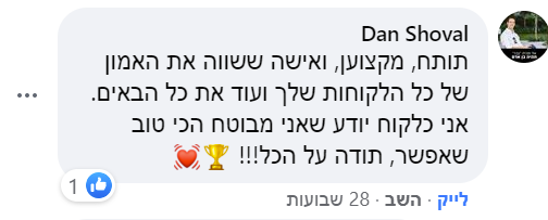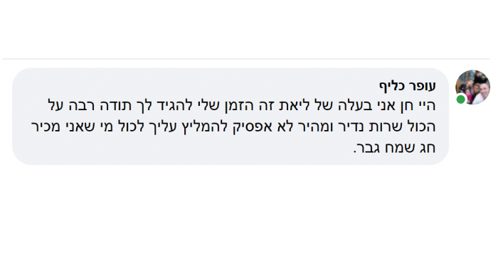 עד אז לא ידעתי מה זה אומר להיות באמת מרוצה- השירות שלך ושל הצוות הוא בסטנדרט הכי גבוה שהכרתי.